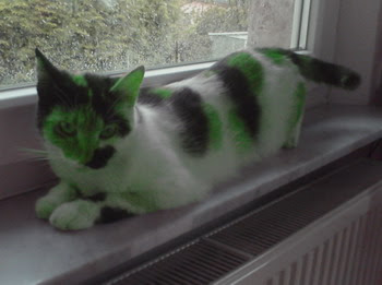 Ich habe die doofe Befürchtung, dass die Bilder echt sind. Pudel sind ja schon seit langem ein beliebtes Objekt für Quälereien durch Schere und Farbe. Warum sollen da Katzen nicht dran glauben müssen? Wenn man sich überlegt, was Menschen alles machen, um Tiere krank zu züchten, warum dann nicht auch noch ein bisschen Farbe?