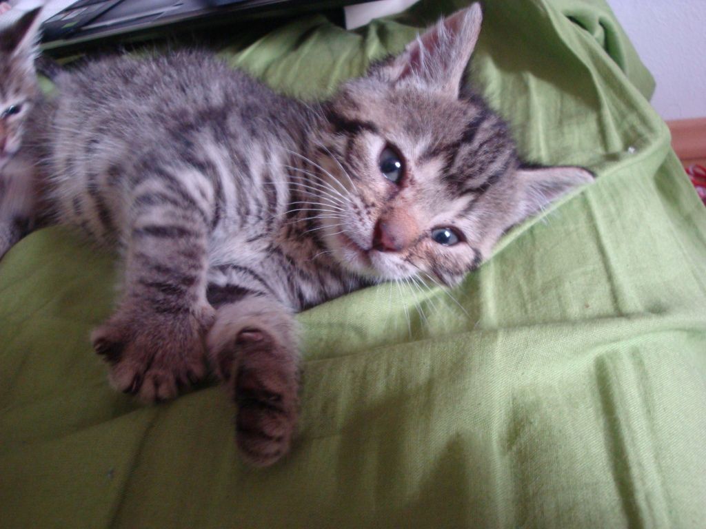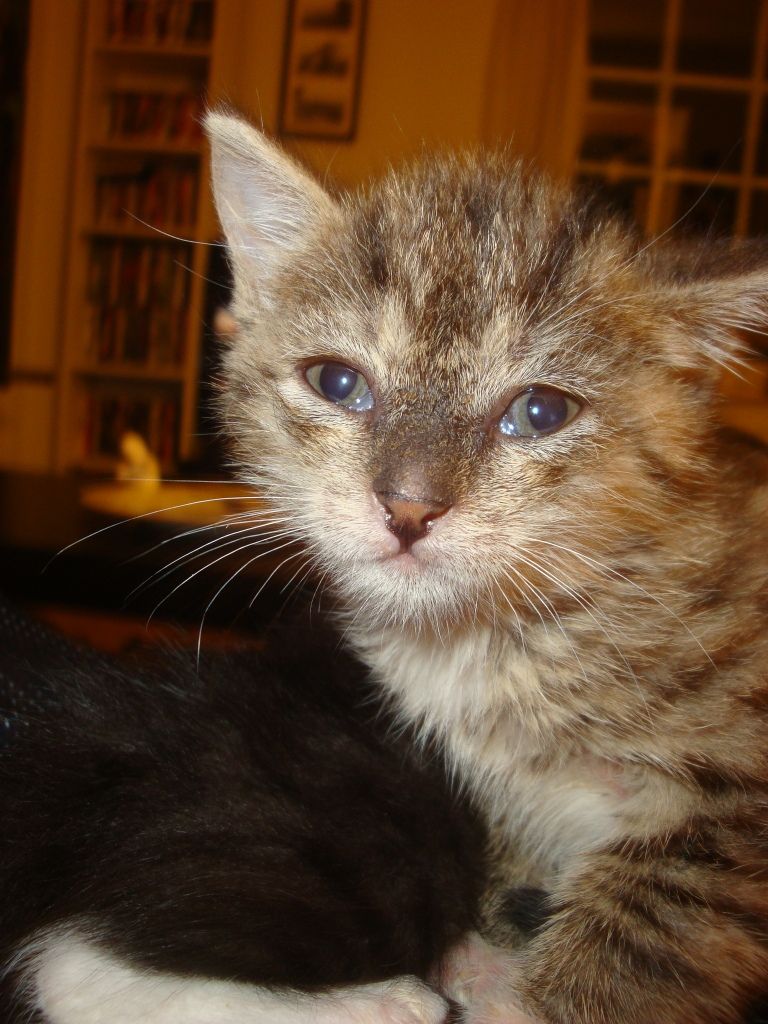 Das "zottelige" strubbelige Fell deutet darauf hin das sich das Kätzchen nicht wohl fühlt, das sieht man auch an den vorgezogenen Nickheuten. Wie alt sind die Kitten denn jetzt? Wurden sie schon mal entwurmt?